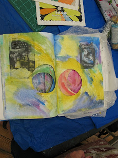 Erin also has a good start on the cover and inside pages. We were working with color last week and bring in our stamps we made and any other things we felt like stamping with. But this last week we added a bit of embellishment to the books.