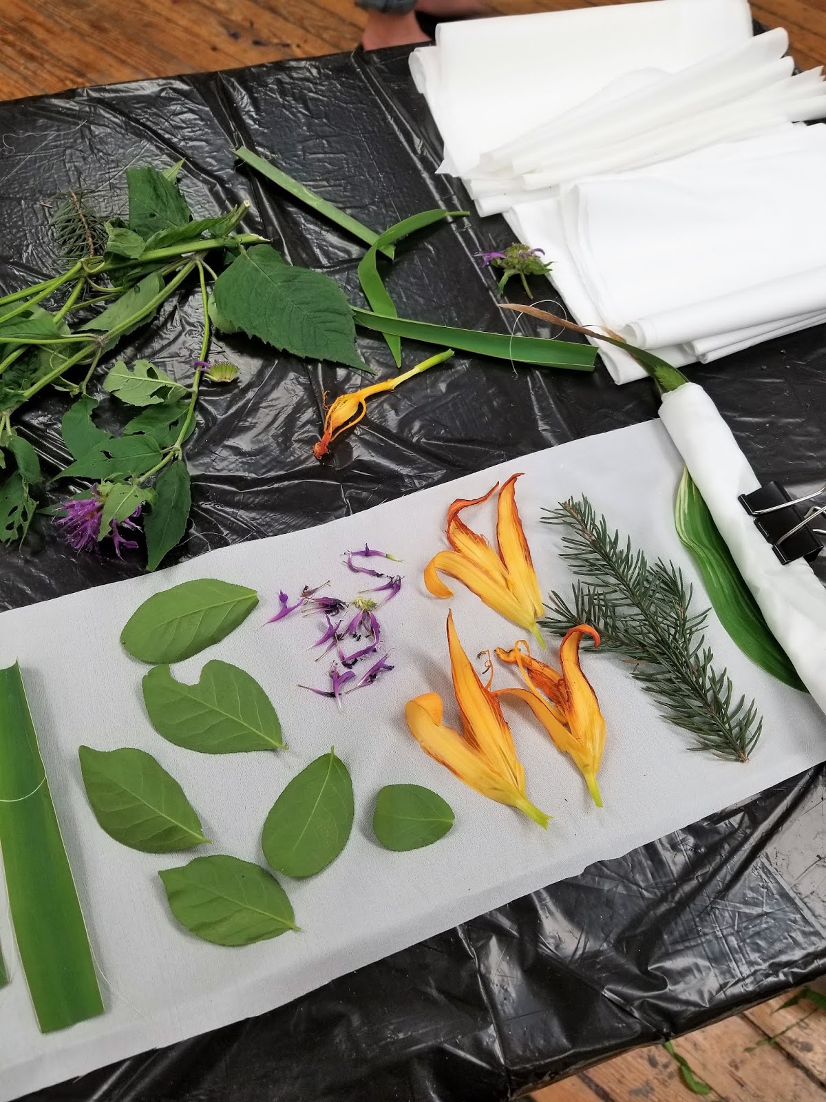 Sarah is our teacher and she is showing us how to place the plants, and blossom on the huge coffee filter and then you have to fold it up. Here she's folding in some old rusty parts too.