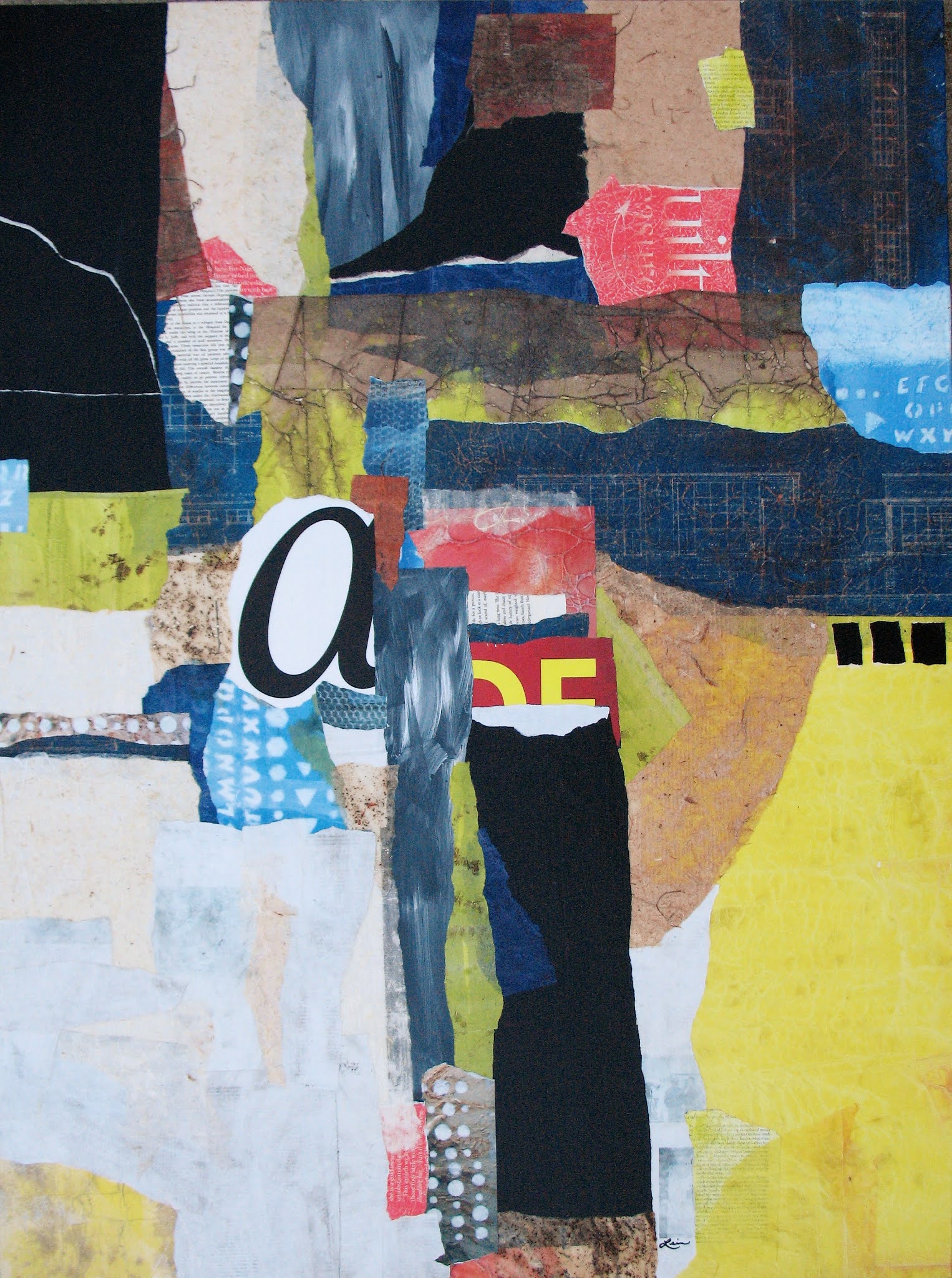 36 x 48 collage on canvas with a wonderful black frame. Still hanging in an empty room on an empty wall on the second floor of the house. I see it every time I wall in there to use the sewing machine. See I have the makers tools spread out all over the second floor because we are empty nesters as of this past year.