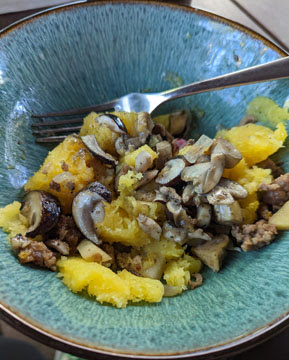 Well took a bit more time to slowly start the day, morning pages, yoga and some arm exercise along with some squats, Walked two miles with Gracie and now I'm hungry. Having an half a stuff Acorn Squash and cooked up some of the Wine Cap mushroom that are now blooming in the back yard.